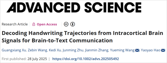 The 2025 International BCI Award recently announced its global list of 12 finalists. Among them is the study “Decoding handwriting trajectories from intracortical brain signals for brain-to-text communication” by Professor Wang Yueming and Dr. Hao Yaoyao’s team at Zhejiang University, published in Advanced Science.Selected from nearly 90 leading projects across 40 countries, this nomination highlights the team’s scientific excellence and China’s growing presence in clinical invasive BCI research.