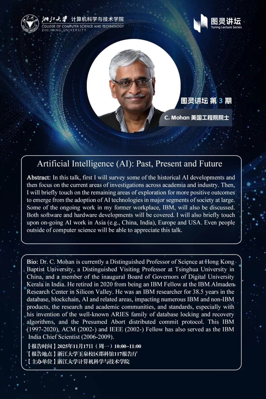 In honor of Alan Turing, the College of Computer Science and Technology at Zhejiang University proudly presents the "Turing Lecture" series. The third edition is now here! We are honored to welcome Dr. C. Mohan—member of the US National Academy of Engineering, Distinguished Professor of Science at Hong Kong Baptist University, and Distinguished Visiting Professor at Tsinghua University—who will deliver an academic lecture titled "AI: Past, Present, and Future." Join us to explore the boundless possibilities of the intelligent age!